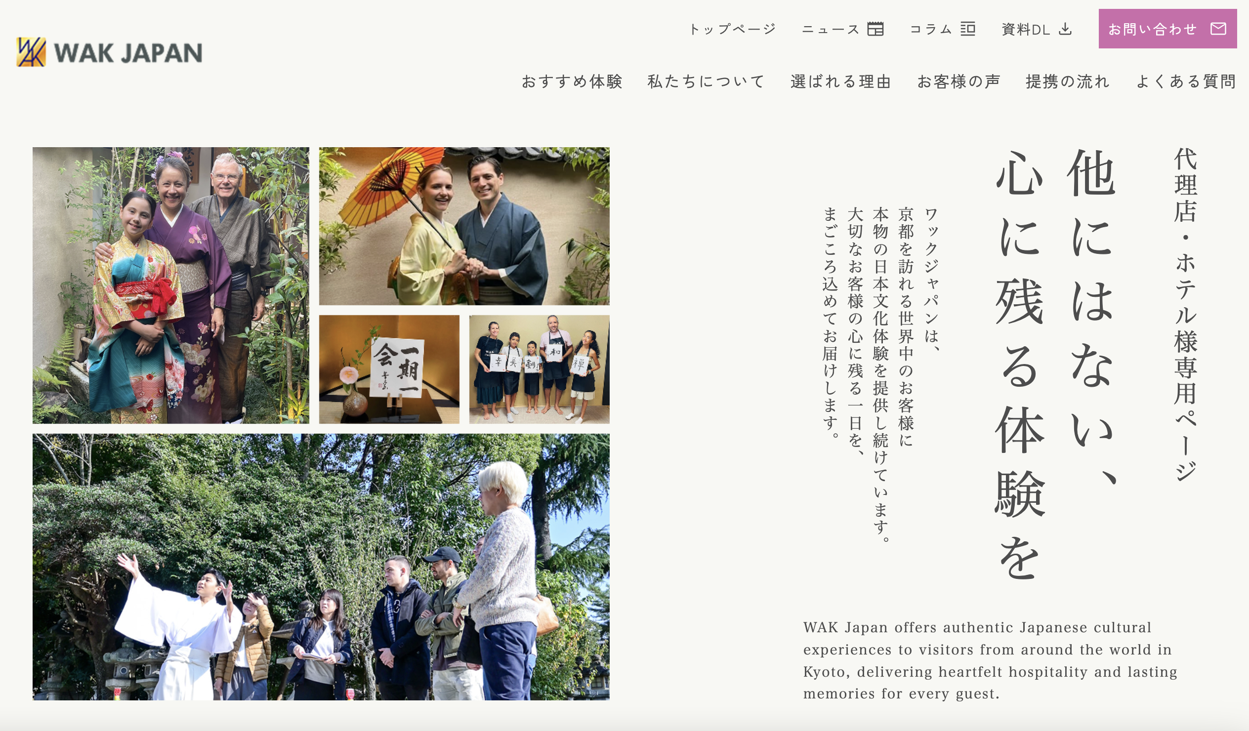 Q.029「なんで地元の女性や留学生が京都を案内するの?」でご紹介しているワックジャパンさんが、旅行代理店・ホテルの方々に向け、より分かりやすく、必要な情報を迅速に取得していただける専用ページを開設されました。
